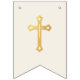 A ivory and gold bunting flags banner fit for religious celebrations like baptisms, first communion or religious confirmations of both sexes. It is gender neutral. Golden caps on ivory background, with 2 faux gold crosses between the words. The message is "God Bless" followed by a 6 letters name (the default is Elisha).