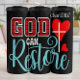 This uplifting design declares "GOD CAN Restore." "GOD" is bold with a red plaid pattern and white outline, while "Restore" flows in a beautiful turquoise script. A prominent red heart and white cross symbolize divine love and the power of restoration, making it a hopeful spiritual message.