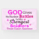 Das Zitat von Brustkrebs auf Inspiration "GOD gibt den schwersten Schlachten für seine stärksten Soldaten" und "Brustkrebs-Bewusstsein" für Brustkrebsüberlebende und Kämpfer, die an Gott glauben.