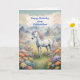 Wünsche für einen magischen Geburtstag. Wünschen Sie Ihrer Patentante einen glücklichen, einsamen Geburtstag. Ein traumhaftes Bild eines weißen Einhorns mit einer Regenbogenhaut in einem Feld von Blume stehend. Im Hintergrund sind majestätische Berge. Die perfekte Karte, um den Lieben magische und mystische Einhörner zu geben.