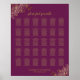 Dieses schöne Hochzeitssitzdiagramm zeichnet sich durch ein schlichtes und dennoch elegantes Design aus, mit einem lila Hintergrund in magenta oder cassis, vergoldeten Imitate-Folientafeln oder floralen Filigrane in den Ecken und einem Schriftzeichen mit dem Titel "Finden Sie Ihren Tisch". Das Diagramm bietet Platz für 300 Gäste an 30 Tischen (10 Plätze pro Tisch).