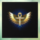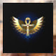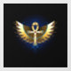 Golden ägyptischer Knöchel mit gemusterten, glänzenden Flügeln auf schwarzem Hintergrund. Magisches Symbol.