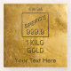 Ein gestempeltes, ein Kilogramm Bar von 999,9 Prozent Reingold. Es erscheint auch das Textlesen, "SPERO'S 999.9" und "1 KILO GOLD" sowie eine Seriennummer. Passen Sie Ihren eigenen Text an.
