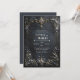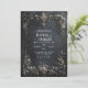 Invite your guests to a celebration of opulent luxury and dramatic elegance with this exquisite wedding invitation. The design features a stunning, rich dark navy and charcoal distressed background, giving it a luxurious, antique texture with subtle gold and gray veins. A prominent ornate gold baroque rectangular frame dominates the scene, heavily detailed with intricate scrolling foliage and blue floral accents. The top and bottom centers are anchored by large sculpted medallions featuring stunning faceted blue gemstones. This entire frame is lavishly draped with delicate blue forget-me-not style flowers and dark gold foliage. This aesthetic conveys a deep, sophisticated richness, perfectly setting the stage for a dramatic, high-end, or formal evening wedding. This invitation card is ideally suited for a masquerade ball wedding reception, a formal historic venue ceremony, or a sophisticated gala anniversary celebration. It would also perfectly suit a regal winter holiday engagement party or an elegant black tie New Year's Eve event. The card's captivating blend of ornate gold accents and deep-toned florals ensures it is versatile for any solemn ceremony, corporate gala, or refined birthday announcement.
