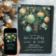 Elegante Weihnachtsfeierlichkeiten mit Kiefernästen, grünen und goldenen Weihnachtsbällchen und Bändern auf schwarzem Hintergrund mit Ihren Details in schicken Schriften, perfekt für Ihre festliche Ansammlung.