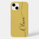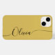 Gold Black Elegant Kalligraphie Script Custom Personalisiert Name iPhone 14 Smart Phone Cases bietet ein modernes und trendy einfaches und stilvolles Design mit Ihrem personalisierten Namen in eleganten handgeschriebenen Kalligraphieskripttypografie auf einem goldenen Hintergrund. Entworfen von ©Evco Studio www.zazzle.com/store/evcostudio