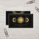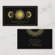 Eine himmlische, ätherische Visitenkarte mit einer modernen Goldsonne mit Sonnenstrahlen und Mondphasen mit einem hübschen, modernen Schriftzeichen-Typ. Fügen Sie Ihren Titel hinzu.
