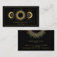 Eine himmlische, ätherische Visitenkarte mit einer modernen Goldsonne Mandala mit Sonnenstrahlen und Mondphasen auf schwarz, mit einem hübschen, modernen Schriftzeichen-Typ. Fügen Sie Ihren Titel hinzu.