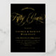 Elegantes Schwarz und Gold 50. Hochzeitsjubiläum Einladung in Schwarz mit goldenen Schriftart. 50. Hochzeitsjubiläum mit goldenen Schriftart vor schwarzem Hintergrund. Fünfzig Jahre in einem Wirblen goldenen Drehbuch. Fügen Sie ein Foto des glücklichen Ehepaares, das ihren 50. Hochzeitstag feiert, auf der Rückseite der Schwarz-Gold-Einladung hinzu. Alle Golddetails werden mit Goldfolie bedruckt.