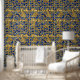 WELTWEIT VERKAUFT UND VERSANDT VON ZAZZLE DESIGNS. ERSTELLT VON TELL3PERSONEN. Gold blaues Mosiac Tiles Muster Peel-Tick-Tapete. Ein tolles Gaumenprojekt für Mieter, Hausbesitzer und Innenarchitekten. Erstellen Sie ein personalisiertes Aussehen für Ihr Zuhause condo Apartment oder Geschäft. Die Wände sind mit Möbeln dekoriert. Erhältlich in texturierter und glatter Vinyl. Größe 2'x4' 2'x8' 2x10' 2'x12' und 2'x1' Uhr