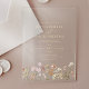 Mit diesen Wildblume Garden Acryleinladungen erfassen Sie das Wesen einer Hochzeit. Jede Einladung ist aus Klaracrylat gefertigt und bietet feine Wildblume-Illustrationen und erdige Töne, die Ihrem Hochzeitsgeschenk ein natürliches, bezauberndes Gefühl geben. Diese Einladungen sind perfekt für Hochzeiten im Freien oder im rustikalen Stil geeignet und verbinden moderne Eleganz mit böhmischem Charme. Persönlich mit Ihren Details in eleganter Schrift für einen unvergesslichen Sake, der die freimütige Eleganz Ihres großen Tages widerspiegelt, verlassend Gäste für die Feier in einem Garten inspiriert Rahmen.