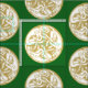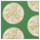 Intrikiertes Trio aus Gold und weißen keltischen Hunden in scheibenförmigen Mustern auf grünem Hintergrund