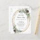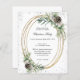 Ein weißer Hintergrund. Ein ovaler goldfarbener Rahmen aus Imitaten, verziert mit Kegeln, weißen Beeren und Kiefernwäldern. Imitate silberner Glitzer, Glitzern. Personalisieren und fügen Sie die Details hinzu. Schwarzer Text. QR-Code auf Ihrer Website für UAWG- und Party-Details. 1 Blatt = 1 Einladung mit Druckkante bis Kante.