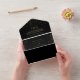 Diese extravagante Konfetti-Kalligrafie-Hochzeit in einer Einladung ist perfekt für eine rustikale Hochzeit. Das schlichte und elegante Design besticht durch glänzende Goldkonfetti in Verbindung mit einer stilvollen Schrift-Typografie. Rett Papier, indem mehr Details in die Einladung aufgenommen werden anstatt auf einer separaten Gehäusekarte.