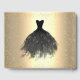 Elegantes schwarzes Kleid, goldenes Konfetti auf einem goldenen Imitat Hintergrund.