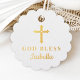 Diese goldenen (oder silbernen) Folien religiösen Taufe Fvor Tags ein Kreuz mit der Gottes-Segen-Formulierung, die mit dem Vornamen des Babys personalisiert werden kann. Auf der Rückseite ist Platz für ein vollfarbiges Foto vorhanden - ideal, um ein beliebtes neugeborenes Foto zu zeigen.