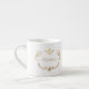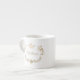 Eleganter, weißer Espresso-Becher, mit einer goldfarbenen Grafik und einem Krontext-Bereich mit individuellem Text. Stellen Sie sich den Text dieser schönen Ergänzung Ihres Esstisches vor.