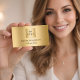 Ein Imitat goldener Hintergrund. Personalisieren Sie Ihr Firmenlogo, Ihren Namen, Ihren Titel und Ihre Kontaktinformationen. Fügen Sie Ihre Website url/link zum Qr-Code hinzu. Mit Facebook und Instagram Icons. Schwarzer Text.