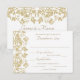 Romantisches Gold und weiße Damast Hochzeitseinladung Antwortkarte mit den Namen von Braut und Bräutigam und Hochzeitstag auf der Rückseite.