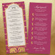Mit unseren personalisierten Hochzeitskarten können Sie Ihre Hochzeitsfeier mit Eleganz und Tradition feiern. Die Vorderseite präsentiert eine wunderschöne Elefant- und Goldlotus-Blume, die in sechs faszinierenden Farben (Rot, Orange, Blau, lila, Rosa und Kohle) erhältlich ist, um Ihr Hochzeitssmotiv zu ergänzen. Alle Texte des Programms können individuell angepasst werden, sodass Sie die Reihenfolge der Veranstaltungen für Ihre Hindu Hochzeitsfeier auf der Vorderseite und eine detaillierte Erklärung der Saptapadi (Sieben Stufen) auf der Rückseite. Dieses exquisite Programm führt nicht nur Ihre Gäste durch die Zeremonie, sondern dient auch als wertvoller Pfand für sie zu schätzen.