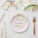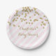 Kundengerechter Namensmädchenbabyduschen-Party-Teller im hellen Pastell errötet rosa und weiße Streifen Muster, Goldconfettimuster und elegante Hand beschrifteter Arttext.