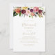Diese goldene Party Einladung ist perfekt für ein modernes Event. Die Gestaltung umfasst handbemalte braune Wildfedern, bohgelbe, weiße, lila, rosa, rot-bordeauxfarbene Blume und blaue Beeren, die in hübschen Bouquets angeordnet sind.