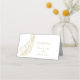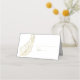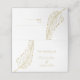 Ein goldenes Federleaf für einen Namen und Tischnummer Platzhalter. Text und Bilder auf beiden Seiten.