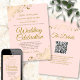 Diese schöne Hochzeitseinladung ist stilvoll, einfach und elegant. Es zeichnet sich durch goldene Schriftzeichen auf einem hellblütenrosa Hintergrund aus, in jeder Ecke mit Filigree aus Imitaten mit Blumenfolie. Das schlichte Design wird durch die verzierten Falten und Wirbel des Kunstwerks ausgeglichen. Der Rücken hat einen individuell anpassbaren QR-Code und einen Detailhinweis, sodass Sie Ihre Gäste zu einer Website für Informationen und UAWG leiten können.