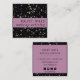Klassische quadratische Visitenkarte mit glitzernden Goldflocken auf einer schwarzen Karte, mit rosa Banner. Ihre Kontaktdaten wie Telefon, E-Mail, Website und Social Media Handle sind auf der Rückseite. Sie können weiter anpassen, um Symbole für soziale Medien zu entfernen, die Sie nicht verwenden, und Symbole, falls erforderlich, neu positionieren.