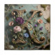 This design is special for its opulent gold scrollwork and dimensional realism, suggesting an ancient heirloom. The letter 'K' features a detailed cracked, teal patina finish, wrapped in mossy vines. The lush, jeweled tones of the purple rose, pale pink peony, and salmon poppy create a striking, romantic, and highly personalized piece of botanical art.