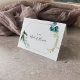Dieses tropische Brautparty mit goldblühender Vegetation ist dank Ihrer Karte ideal für eine Hochzeit in Urlaubsort. Das Design ist vorwiegend handbemalt, grünes Blattwerk mit goldenen Blume, das einen eleganten geometrischen Rahmen schmückt.