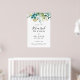 Das Begrüßungszeichen der tropischen Probe mit goldgelben Blumen ist perfekt für eine moderne Hochzeitsfeier und Probe. Das Design zeichnet sich vor allem durch handbemaltes grünes Blattwerk in Aquarell und goldene Blume aus.