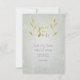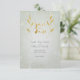 Ein schönes Goldblatt, Goldfolie-Effekt auf schlauem, grün-farbenem Glasboden, bilden einen außergewöhnlichen Rahmen an diesem Hochzeitstag Rett-The-Date-Karten. Ideal für goldene Hochzeitsthemen und viele andere Einstellungen. Fügen Sie einfach Ihre eigenen Daten in den Vorlagenbereich oben hinzu, und wenn Sie weitere Änderungen benötigen, klicken Sie auf den Button "Anpassen" oben. Bitte beachten Sie, dass es sich um flache, bedruckte Karten handelt und der Goldfolieneffekt ein hochwertiges Bild unseres eigenen Designs ist. Entsprechende Einladungen für Hochzeiten, UAWG, Tischnummern, Briefmarke und Dankeschön-Karten stehen zur Verfügung.