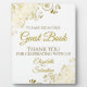 Dieses elegante, stehende Schild oder eine Plakette empfängt Sie, um Ihr Hochzeitsgast-Buch zu unterschreiben. Es ist vollständig anpassbar und wurde für die Koordination mit unserer Gold Foil Elegant Wedding Suite konzipiert. Es zeichnet sich durch ein schlichtes, aber extravagantes Design aus, mit Goldtext auf weißem Hintergrund mit einer vergoldeten Imitat-Folie, die in den Ecken fein blumengeschmückt ist.