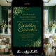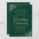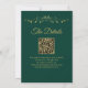Diese schöne Hochzeitseinladung ist stilvoll, einfach und elegant. Es zeichnet sich durch goldene Schriftzeichen auf einem smaragdgrünen Hintergrund aus, in jeder Ecke mit Filigree aus Imitaten aus Blumen. Das schlichte Design wird durch die verzierten Falten und Wirbel des Kunstwerks ausgeglichen. Der Rücken hat einen individuell anpassbaren QR-Code und einen Detailhinweis, sodass Sie Ihre Gäste zu einer Website für Informationen und UAWG leiten können.