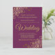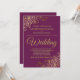 Diese schlichte und dennoch elegante Hochzeitseinladung bietet goldene Schriftzeichen auf magenta oder cassis lila Hintergrund. Das Design ist schlicht, aber die Ecken sind mit einer verzierten Imitat-Folie floralen Filigree mit Rollen und Falten versehen. Der Text ist formell und traditionell, aber das schicke Design macht diese Einladung für jede Hochzeit geeignet.