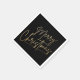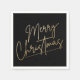 Frohe Weihnachtstexte in extravaganter Schrift in goldenen Imitate-Folie sind auf schwarzen Urlaubspapieren Servietten zu sehen. PAPIERE Teller und mehr in unserem Geschäft.