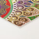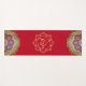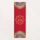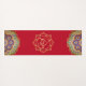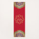 Indische inspirierte Yogamat in Rot, mit einem goldenen Ton dekorativen Ganesha, in der Mitte. Grafiken von bunten Mandalasen schmücken beide Enden der Matte. Das gleiche Design ist sowohl auf der Vorder- als auch auf der Rückseite der Matte zu sehen.