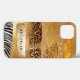 "Gold Girly Leopard Zebra Giraffe Cheetah Print mit Gold Glitzer Hintergrund und Ihrem Namen personalisiert iPhone 13 Case." Sparkling Leopard, Giraffe, Cheetah und Zebra druckt mit verschiedenen goldenen Glitzer Akzent Overlays und einem goldenen Pinselstrich, der Ihren Namen personalisiert umrahmt. Das perfekte Design für ein wildes Mädchen!