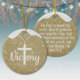 Gold Glitter Religious Holiday Decoration, an ideal Xmas gift for sharing faith and joy. The front displays the elegant white cursive word "Victory," with a majestic large Cross on a beaded necklace substituting the letter T, all set against a Golden shimmering background that evokes a festive winter sparkle. On the back, the same background features the profound Bible verse John 3:16: "For God so loved the world, that he gave his only begotten Son, that whosoever believeth in him should not perish, but have everlasting life," in white customizable text for a truly personal devotional touch. This hanging Christmas ornament captures the essence of holy spirit, worship, and inspirational Jesus teachings from the testaments, serving as a sacred writing present tag. As a custom keepsake embodying doctrine, divine passages, and the word of our Lord, it's perfect for Christian decor during the holiday season. Editable and personalizable elements allow you to tailor this uplifting design to your heart's desire. Plus, transfer this versatile sacred motif to your choice of many products on Zazzle, from mugs to apparel, for endless inspirational options. Customize your Christ heirloom now and spread divine light this season!