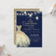 Elegantes goldenes Kleid, Tiara und Streichellichter auf marineblau-blauem Hintergrund.