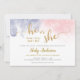 Dieses horizontale Geschlecht offenbart Party Einladung mit einem goldenen Imitat Glitzer Kalligraphie-Text auf einem rosa und dunkelblauen Aquarell Hintergrund. Personalisieren Sie diese unterhaltsame und moderne Einladung mit Ihrem Geschlecht enthüllen Party-Informationen.