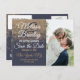 Glamouröse, schicke und elegante Imitate druckten funkelnd Goldpreis auf marineblauen, Rett-the-Date-Hochzeitskarten. Dieses klassische und raffinierte Design ist perfekt für das trendige und stilvolle Ehepaar. Personalisieren Sie Ihre eigene Nachricht auf der Vorderseite sowie ein individuelles Monogramm auf der Rückseite. Das gesamte Foto-Druckdesign.