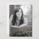 Eine moderne Abschluss-Einladung mit einem Foto Ihres Abschlusses mit Gold Glitzer Look Skript-Schrift und Konfetti. Der Rücken kann als Einladung für eine Graduiertenparty genutzt werden oder als Ankündigung genutzt werden.