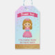 Niedliche Geburtstag Party Geschenketiketten mit einer bezaubernden kleinen Prinzessin mit moderner Typografie auf pastellfarbenem Regenbogengradientenhintergrund.
