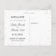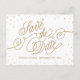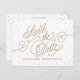 Winzige, glänzende Goldsterne funkeln in Konfetti-Wolken um den Rand dieser wunderschönen, goldfarbenen und weißen Save the Date Postkarte, mit einem goldenen Glitzer-Effekt-Skript, "Save the Date". Extravagant, schick und bezaubernd auf einmal. Original-Kunstwerk von Colleen Michele. Bitte beachten Sie, dass auf den Sternen und dem Drehbuch kein echter Glitzer- oder Goldblatteffekt zu sehen ist; in dieser Einladung wird kein Glitzer, Goldblatt oder Metallfarbe verwendet.