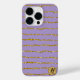 Ein gewellter, gestreifter goldfarbener Glitzer auf violettem Hintergrund. Personalisieren Sie mit einem Initial auf einem Goldfolienkreis.