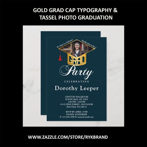 Gold Grad Cap Typografie & Tassel Foto Abschluss Banner. Dieses Banner mit einer schlanken, einfachen Graduierenkappe und einer schönen, fließenden Tassel zeichnet sich durch eine raffinierte Kombination aus Kalligraphie und Typografie aus. Am unteren Rand der Kappe wird der Begriff "Party" exquisit in Kalligraphie dargestellt, indem eine besondere Touch hinzugefügt wird, während das Wort "Grad" in Typografie eingetragen ist. Das Foto der Absolventen, das den Geist ihres einzigartigen Anlasses einfängt, kann an der Spitze der Kappe platziert werden. Fügen Sie den Namen Ihres Absolventen und die Schule, die sie besuchen, um diese wunderbare Banner personalisieren. Es ist die ideale Methode, um einen bedeutenden Anlass zu gedenken und zu gedenken und die spannende nächste Phase ihres akademischen Weges zu vermitteln!