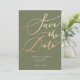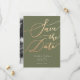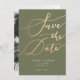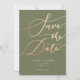 Elegante und einfache Hochzeit speichern Sie die Dattelkarte. Der handgeschriebene Typografietext ist in Imitaten goldener Glitzer vor einem olivgrünem Hintergrund.