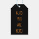 Goldener Schädel vorne mit schwarzem Hintergrund und "Danke fürs Kommen" auf einer Seite mit "Glad You Are Here" auf der Rückseite, beide in orangefarbenem Text. Skull Halloween-Party Geschenk bevorzugt Tags.